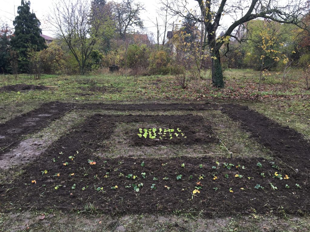 A 2018-19-es tanév folyamán a Szentendrei Móricz Zsigmond Gimnázium 9/A osztálya belevágott az iskola udvarának ritkán látogatott hátsó traktusának átalakításába. Ezt a kertalakítási munkát segítjük az INSPIRES projekt keretében, s hozzá kapcsolódva többféle módszerrel vizsgáljuk, változik-e a kert hatására a diákok egymáshoz és a természethez fűződő viszonya. Az iskolakert megtervezése és kialakítása a kezdetektől fogva a diákokkal és a tanárokkal közösen történik. A kezdetekben öröm-bánat térképet készítettünk, hogy feltérképezzük, az udvar mely pontjai a legizgalmasabbak: hol van a legtöbb örömforrás, hol lenne a legtöbb teendő. Az egyik ilyen „forró pontot” választottuk a kert helyszínének, ahol utána a biológia és kémia órák keretében néhány alapvető vizsgálat is készült, pl. a talajtakaró növényzetről és a talaj kémiai összetételéről. Míg az ültetendő fajok kiválasztása és elrendezése papíron, osztályteremben zajlott, a kertben fizikai munkára is sor került: meg kellett találni a vízvezetéket a kerti csap létesítéséhez, fel kellett ásni a területet, s már az ősszel földbe kerültek a cserjék és a hagymás növények.