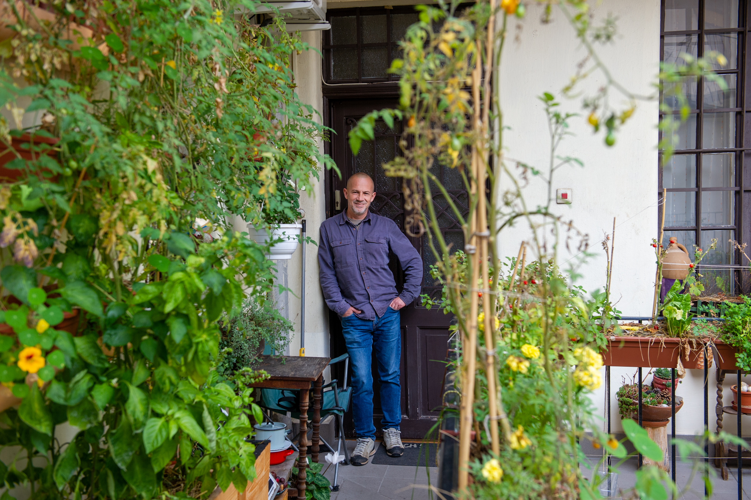 Lőrinczi István a gangján alakított ki egy olyan kertet, ahol több, mint 80 féle növényt termeszt. Fotó: Beliczay László.